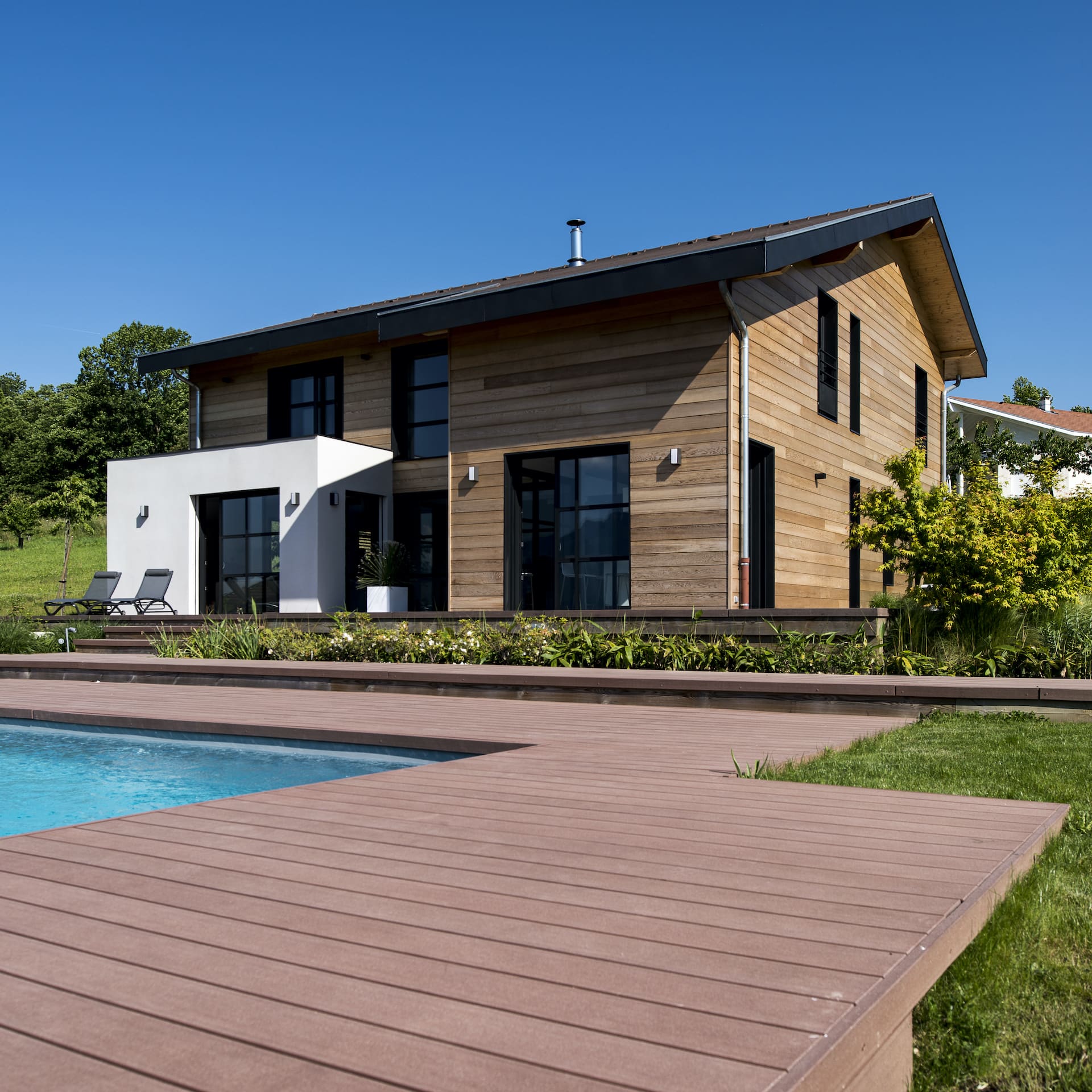 Cette maison en ossature bois située à Saint Jean de Moirans en Isère, bénéficie de 209m2. Elle se compose de X chambre sur mesure, X pièce d’eau appropriés, X salon et X cuisine ingénieusement aménagé (+ terrasse, piscine).
