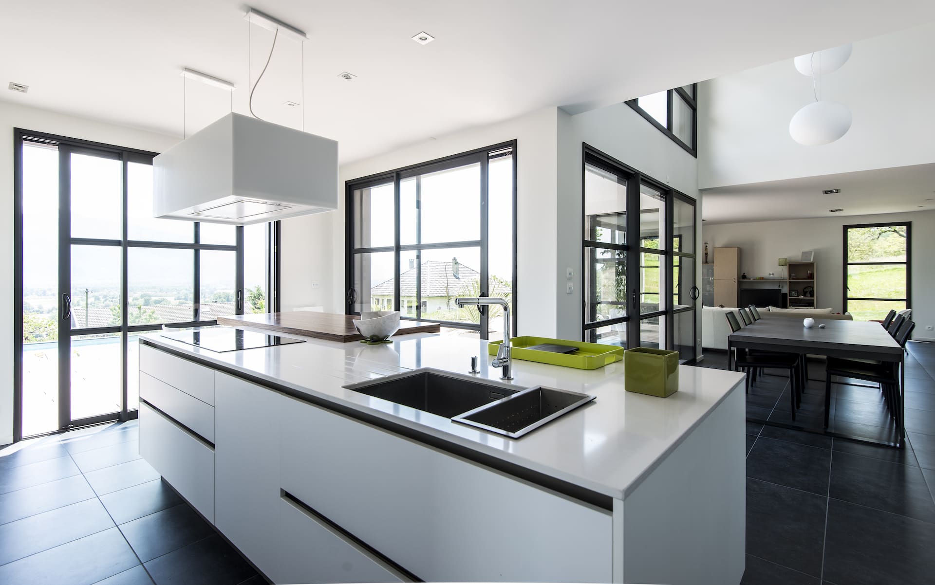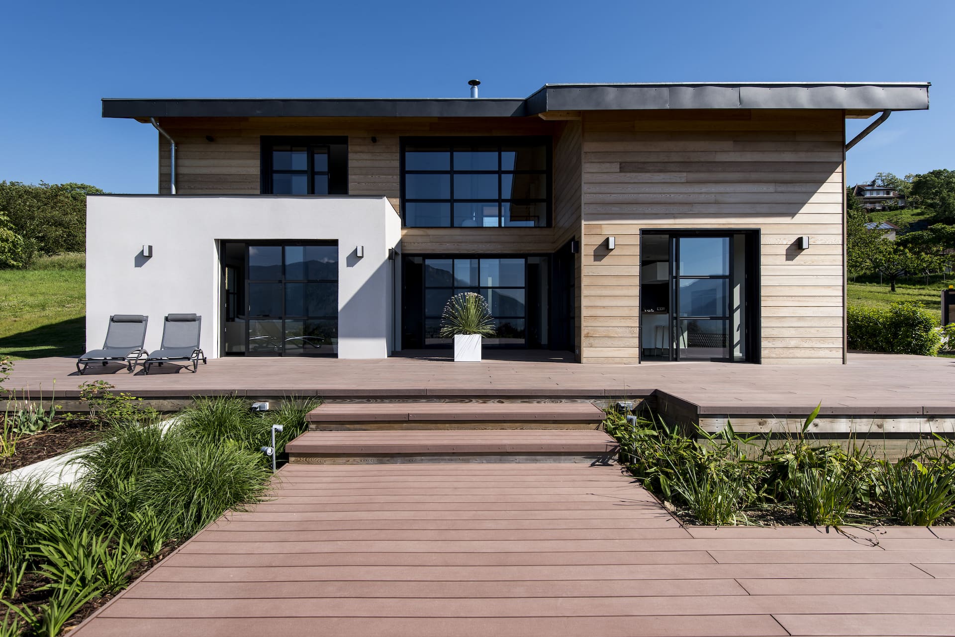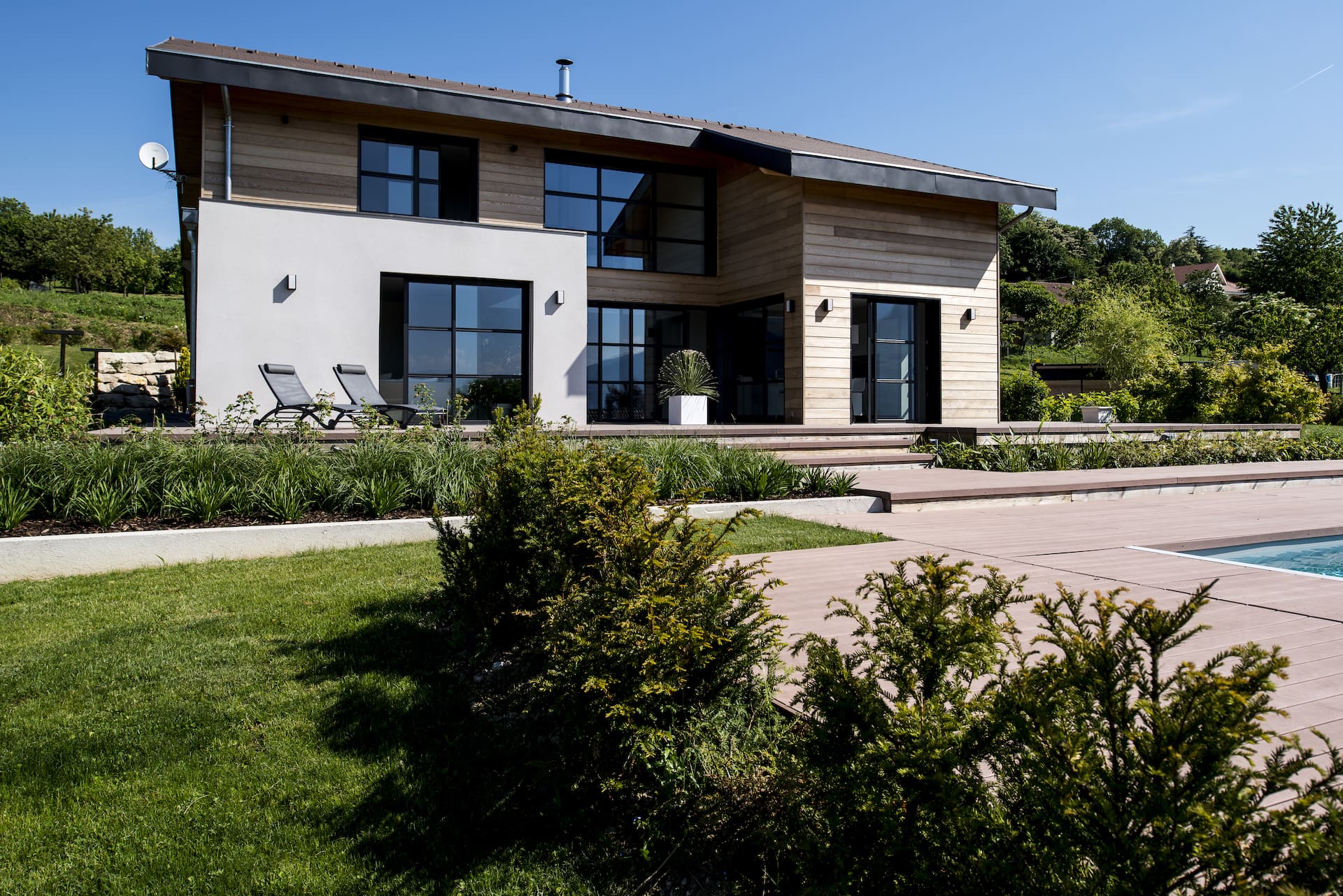 La caractéristique de ce projet est qu’il a été conçu en exploitant au mieux la lumière naturelle. De grandes baies vitrées lui confèrent cet aspect contemporain accentué par sa façade mixte. Les espaces de vie organisés autour d’une terrasse s’ouvrent sur le paysage et offrent un intérieur spacieux et lumineux.