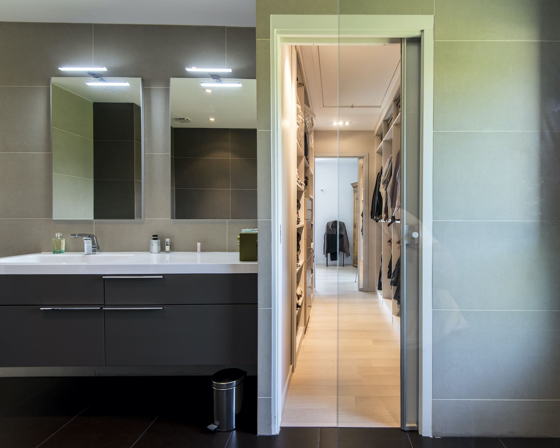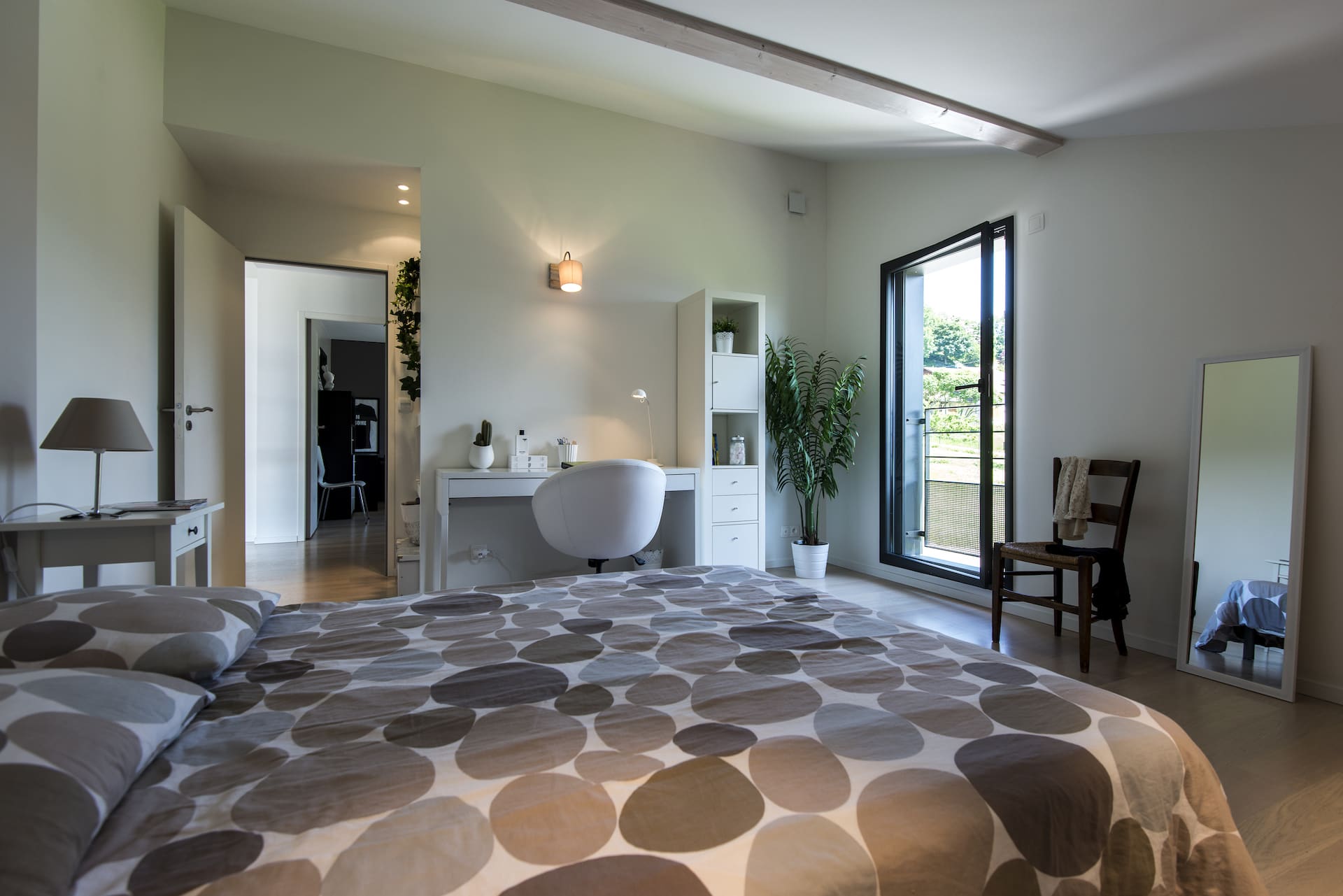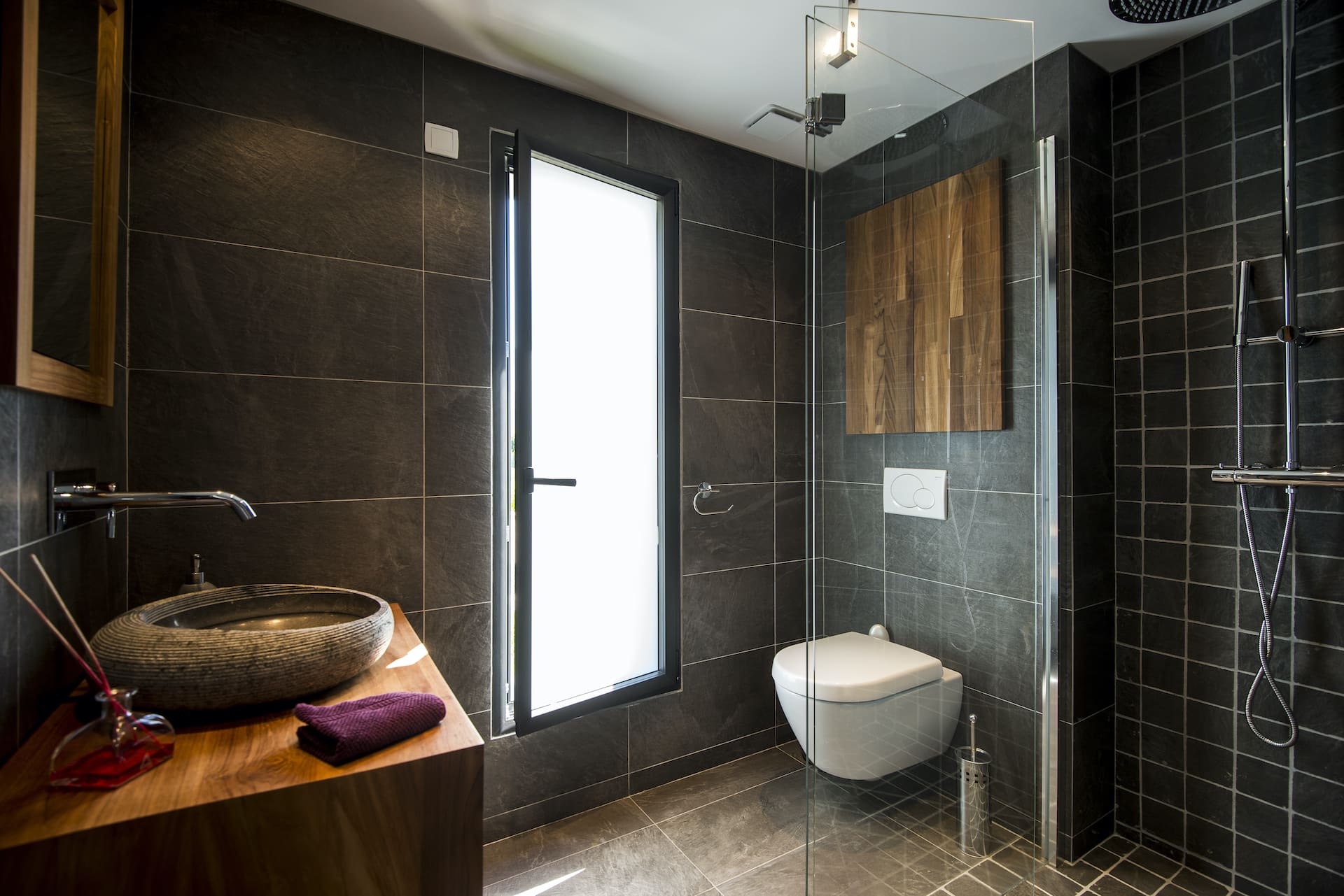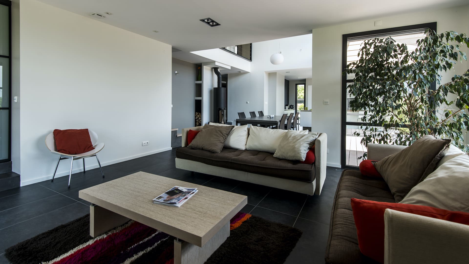 La caractéristique de ce projet est qu’il a été conçu en exploitant au mieux la lumière naturelle. De grandes baies vitrées lui confèrent cet aspect contemporain accentué par sa façade mixte. Les espaces de vie organisés autour d’une terrasse s’ouvrent sur le paysage et offrent un intérieur spacieux et lumineux.